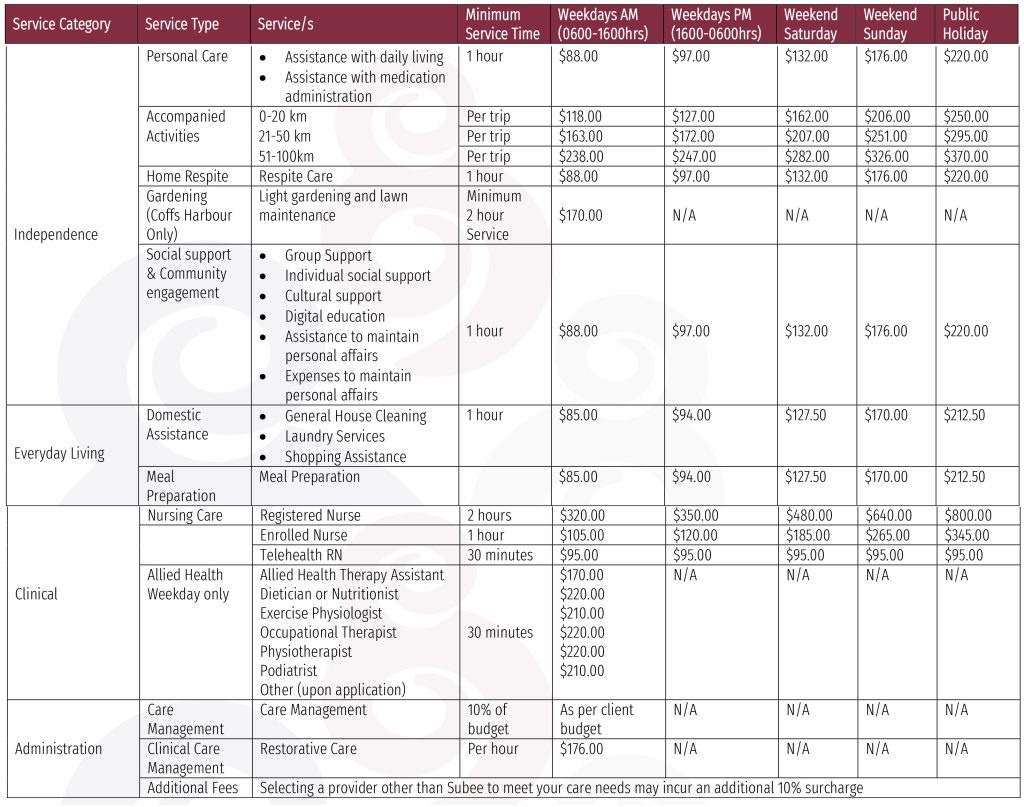 Subee provides a simple and very competitive Schedule of Fees for older Australians in receipt of Support at Home Packages.